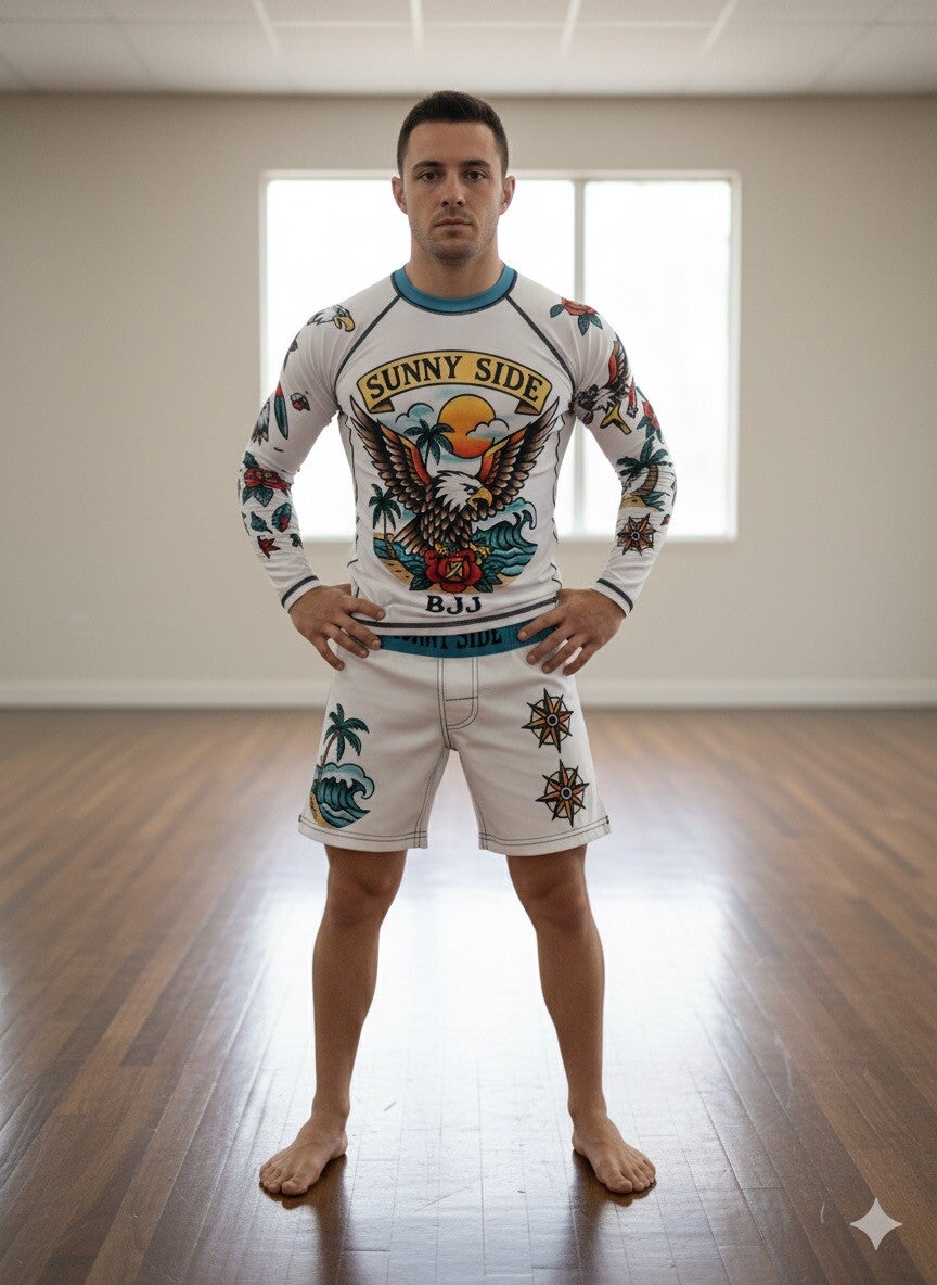 Channel bold energy and coastal grit with the Sunny Side BJJ Rashguard Set — a vibrant, long-sleeve rashguard and matching shorts combo designed for performance and style. Featuring a powerful eagle graphic set against palm trees, ocean waves, and a radiant sunset, this set captures the spirit of adventure and resilience. Nautical elements like compasses and wave patterns add depth and movement to the design.