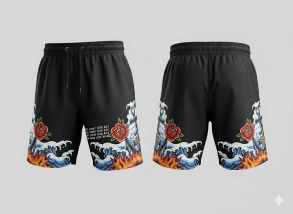 • 🔥 Shorts: Central anchor wrapped in rope, framed by flames and roses. The repeating “Sunny Side BJJ" text adds a cryptic, punk edge—perfect for those who don’t follow the crowd.