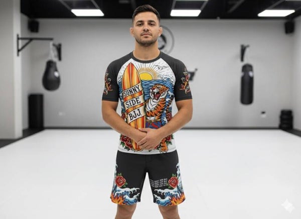 • 🐅 Front Rashguard: A tiger in mma shorts stands proud on a sunlit beach, clutching a surfboard emblazoned with Sunny Side BJJ. Waves crash behind him, roses bloom below—symbolizing strength, serenity, and style.